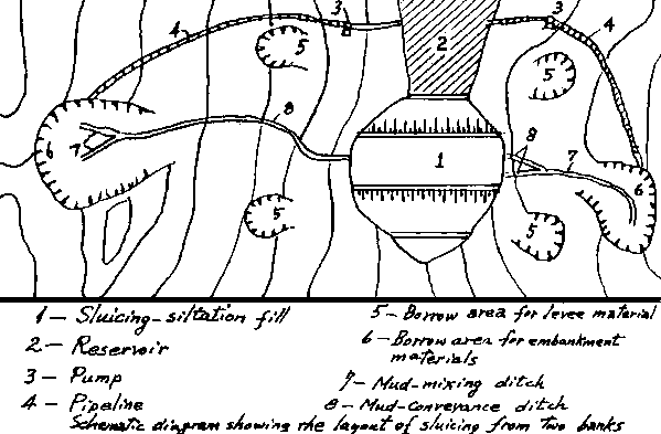 Sluicing-siltation operation may proceed from one bank or from both banks of a gully (or rivulet or river) according to the locations of the borrow areas. The operation may also be intermittent or continuous according to the sluicing requirement.