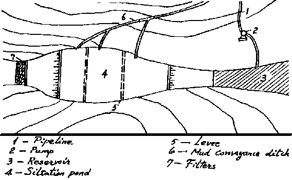 The functions of the mud ditches are to first mix the slurry and then convey it to the embankment where it is to be deposited. Therefore, the ditches are divided into two sections: those for preparing the slurry at the borrow area are referred to as mud-mixing ditches and those for conveyance ditches are called canals.