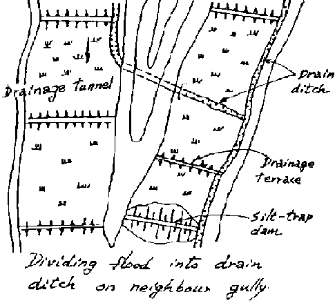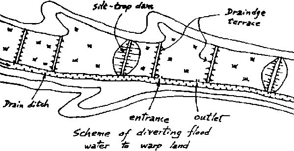Drawing of floodwater at hyper-concentration of sediment for warping has proved to be an effective measure to meet the demand of water for plants in arid season. The soil fertility is improved and the farmland could be leveled and reclaimed. Ditches could be filled up and the seepage of the ponds could be prevented. In view of all these multiple benefits, it is recommended as an effective method for sediment trap and flood control in watersheds where soil loss is prominent.
