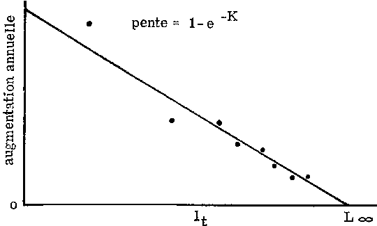 Si l'on inscrit la vitesse de croissance en longueur en fonction de la longueur, on obtient fréquemment une droite coupant l'axe des X en un point L¥ au-delà duquel le poisson ne grandit plus, et qui correspond à l'asymptote de la courbe longueur/âge. Si l'on a une relation linéaire entre taux de croissance en longueur et longueur, cela signifie, en termes mathématiques: