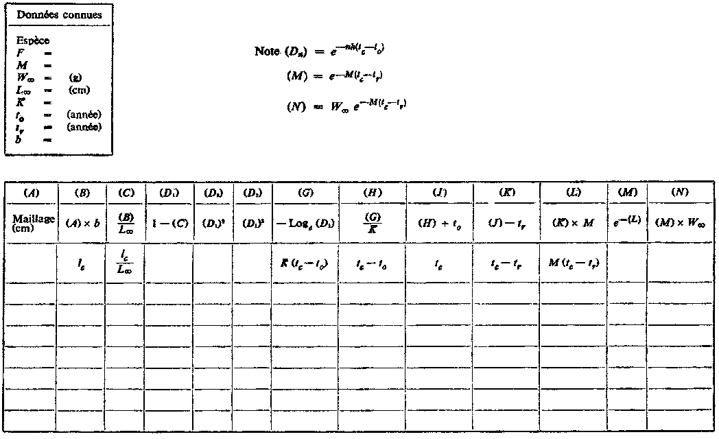 Pour intégrer aisément cette formule, il faut donner à l'expression du poids une forme appropriée. Parmi les équations de croissance examinées plus haut, l'une des plus pratiques est celle de von Bertalanffy. Nous pouvons écrire: