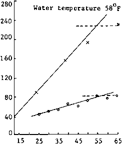 Gross protein requirements have been determined for a few species of fish (see Table 1). Simulated whole egg protein component of test diets contains an excess of indispensable amino acids. These diets were kept approximately isocaloric by adjusting total protein plus digestible carbohydrate components to a fixed amount as the protein diet treatments were varied over the ranges tested. Tests in feeding fry, fingerling, and yearling fish have shown that gross protein requirements are highest in initial feeding fry and that they decrease as fish size increases. To grow at the maximum rate, fry must have a diet in which nearly half of the digestible ingredients consist of balanced protein; at 6-8 weeks this requirement is decreased to about 40 percent of the diet for salmon and trout and to about 35 percent of the diet for yearling salmonids raised at standard environmental temperature (SET). See Figures 1 and 2. Gross protein requirements for young Catfish appear to be less than those for salmonids. Initially feeding fry require that about 50 percent of the digestible components of the ration be protein, and the requirement decreases with size. Some feeding trials with salmon have indicated direct relationships between changes in the protein requirements of young fish and changes in water temperature. Chinook salmon in 7 C water require about 40 percent whole egg protein for maximum growth; the same fish in 15 C water require about 50 percent protein. Salmon, trout and catfish can use more protein than required for maximum growth because of efficiency in eliminating nitrogenous wastes in the form of soluble ammonia compounds through the gill tissue directly into the water environment. This system for eliminating nitrogen is more efficient than that available to fowl and mammals. Fowl and mammals consume energy to synthesize urea, uric acid, or other nitrogen compounds which are excreted through the kidney tissue and expelled in urine. Digestible carbohydrate and fat will spare excess protein in the diet as long as the protein requirement for maximum growth is met (Figures 1 and 2).
