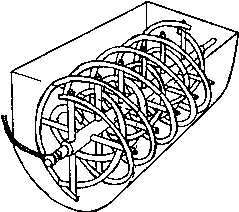 The continuous or "twin-spiral" mixer consists of a horizontal, stationary, half-cylinder with revolving helical ribbons placed on a central shaft so as to move materials from one end to the other as the shaft and ribbon rotate inside (Figure 2). Capacity can be from a few litres to several cubic metres. The speed of shaft rotation will vary inversely as the circumference of the outer ribbon; usually optimum between 75-100 metres per minute. Since material travel is from one end to the other, either end may be used for discharge. These mixers may be inverted for cleaning.
