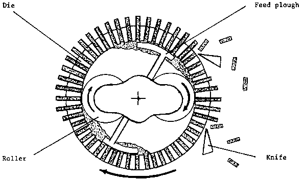 Figure 4b shows how pellets are extruded from a small vertical die assembly with two rollers.