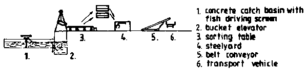 Figure 16. The scheme of complex fish harvesting systems in Hungary c) Central fish harvesting place with indoor sorting (Biharugra State Farm)