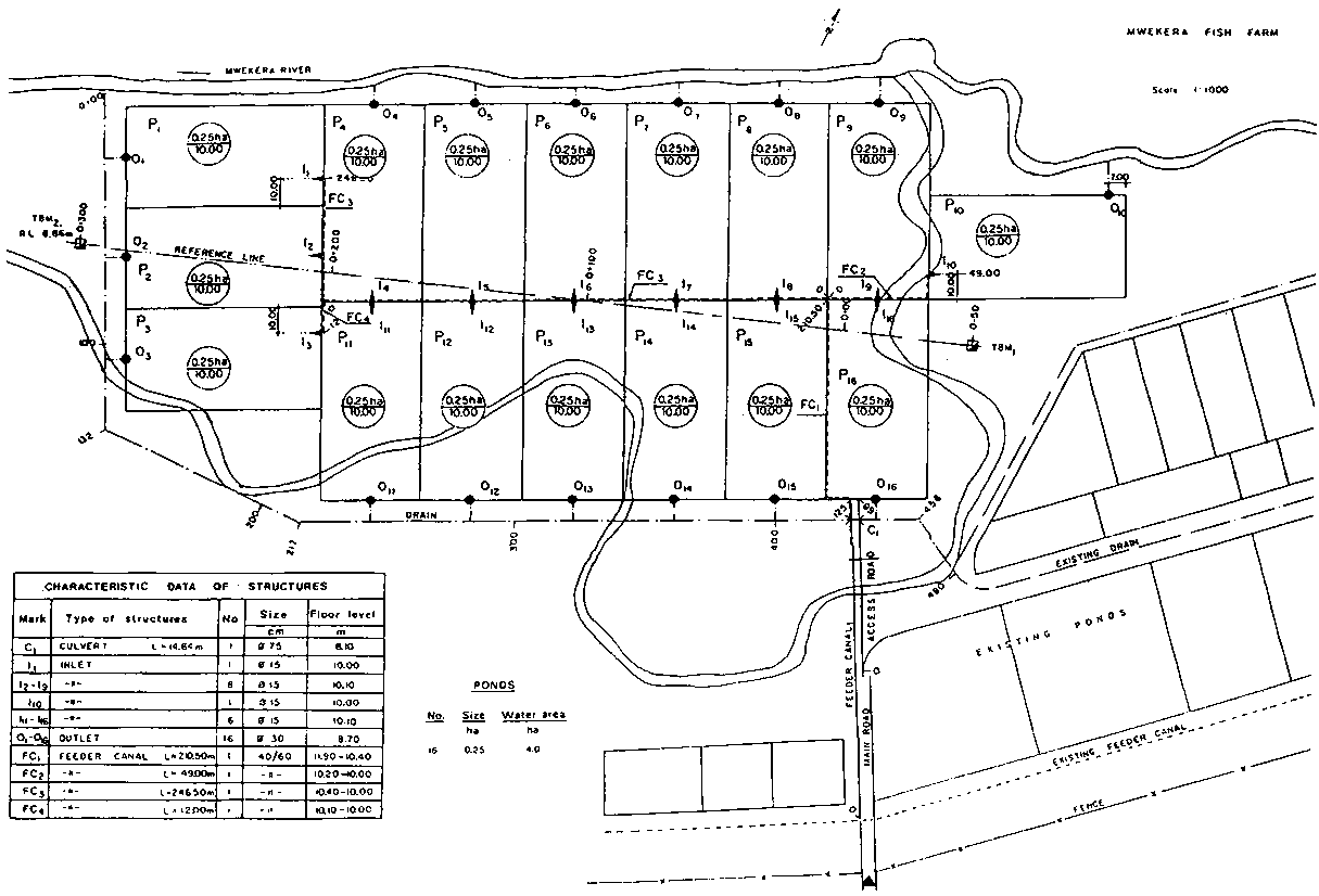 This plan to a scale of 1:1000 to 1:5000 should include the arrangements of the ponds, the water supply and drainage systems as well as the location of the hatchery and other buildings including the proposed approach road and the power and telephone lines.(v) Outline cross-sections of dikes and channels