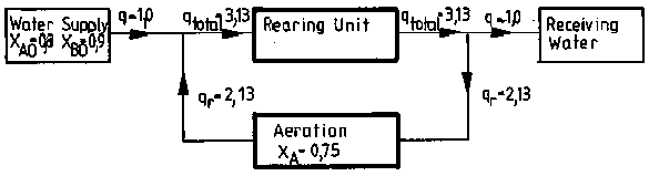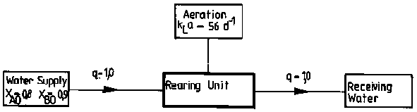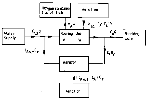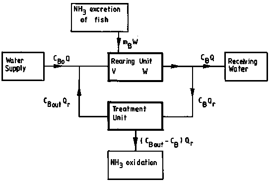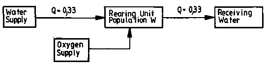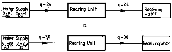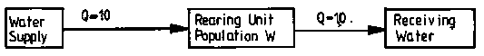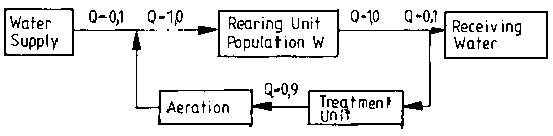 There are two general types of water recirculation systems: the simple recirculation system and the complex recirculation system. These systems differ from the single-pass system that is shown in Figure la, where Q represents water flow rate required to ensure proper oxygen supply for the animals in the rearing unit, and where Q = 1.0 is the flow rate that is required for a given population (W) in the rearing unit.