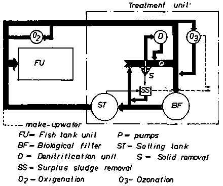 In the complex recirculation system a high reduction of water supply can be achieved by employing a water treatment unit, which besides employing re-aeration and mechanical filtration, at least one biological treatment is used. An example of a complex recirculation system is shown in Figure Id where the water supply needed to support a given fish population is reduced to one-tenth of that needed in a single-pass system. In recently developed complex recirculation systems more internal by-pass water cycles can be found, as is shown in Figure 2. These systems usually are semi-closed or quasi-closed systems. The term "closed system" is used when the water is supplied only for filling and to replace evaporation. A common aquarium with a bottom sand-filter may be described as a closed system.
