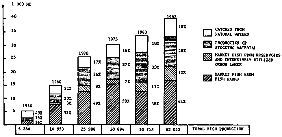 The data in Figure 1 indicate that fish captures from extensively used natural waters have also increased steadily. It should be noted here that in accordance with the Hungarian statistical system, the anglers' catches are recorded and the fish captured by anglers have risen sharply with rapid increase of sport fishing activities.