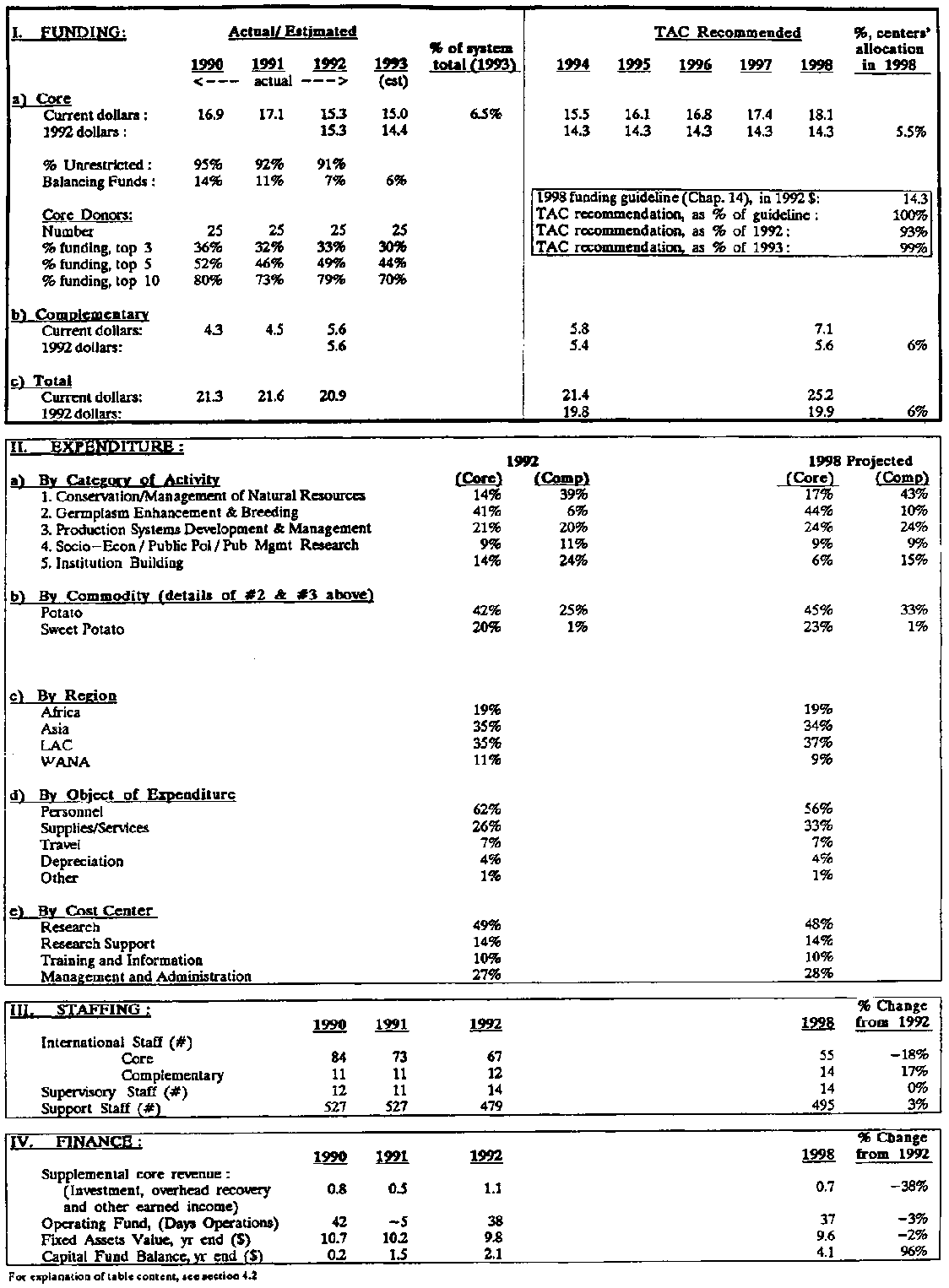 For 1994, TAC recommends core funding of US$ 14.3 million in 1992 dollars or US$ 15.5 million in current values. Together with a projected complementary funding of US$ 5.8 million, CIP's total funding in 1994 would amount to US$ 21.4 million. In addition to the core funding of US$ 15.5 million, TAC recommends to reinstate the one-time compensation of US$ 950,000 in 1994 to allow CIP to restore its working capital which was virtually depleted in 1989-92 as a consequence of difficult economic circumstances in its host country.