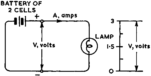 A battery presents a steady potential difference (pd), or voltage (V) across its terminals Fig. 1, and if, for example, a lamp is connected to the terminals a direct current will flow through both circuit and battery. Work is being done because electrical energy is being converted to light as the current flows through the lamp filament. The amount of energy changed from electricity to light when measured over a period of time is known as the power (W, watts) dissipated and this is controlled by the voltage (V) of the battery and the amount of current (A) which is flowing. In fact a small proportion of the energy is 'wasted' in the form of heat but this is not important to the present explanation.