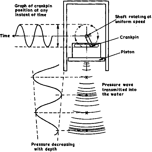 Pressure is most easily thought of as a mechanical force. It can be generated by the movement of a piston as shown in Figure 5. If the constant speed rotation of the shaft is transmitted by the crankpin to the piston in the manner illustrated, the result is a sinusoidal motion. This sets up an acoustic pressure wave of sinusoidal oscillations in the water with regions of compression and rarefaction relative to the mean pressure, see Figure 5. In acoustics we are concerned with sinewaves in a similar way to the electrical sinewaves discussed in section 2.2, i.e. the 'work done' or the power used is the rms value. Any practical measurement of acoustic waves is made by observing the electrical output signal (sinewaves) of a pressure sensitive device (transducer). In other words the sinusoidal pressure wave is converted into an equivalent electrical sinewave from which the acoustic properties can be determined.