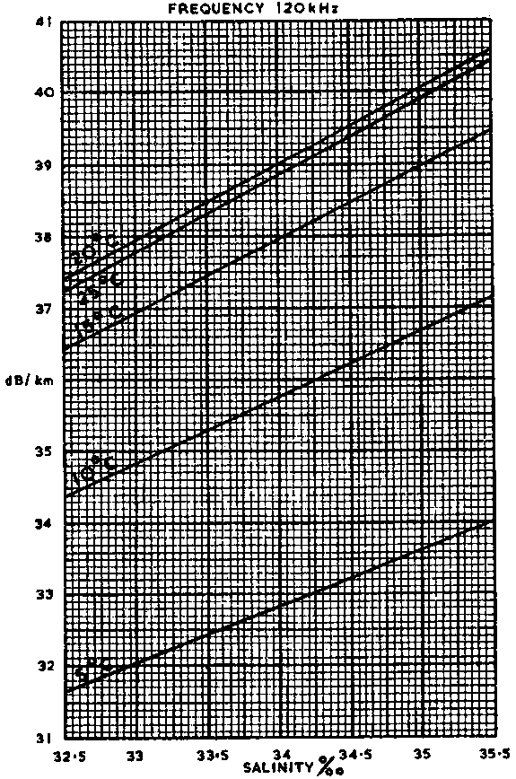 There is a marked temperature dependence but this exhibits different characteristics; at the low end of the frequency scale below 70 kHz where there is a negative gradient, an increase in temperature gives a reduced a. At 120 kHz the gradient is first positive, then negative as in Figure 10(a). These figures are calculated from a formula derived by Fisher and Simmons (1977) after a series of experiments and it is believed to give the most accurate results currently available for fisheries acoustic work. Further research is needed to confirm the validity of the results for all conditions of temperature and salinity likely to be encountered in practical surveys. Nevertheless it is recommended that the graphs in Figures 9 and 10(a)(b)(c) be used to select the value of a for surveys until further results are forthcoming. Variation of the values of absorption for changes in salinity at commonly used acoustic survey frequencies are plotted in Figure 10(b)(c).