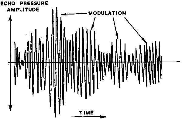 If the fish were steadily rotated in the plane for which Figure 13 was drawn, the echo amplitude would fluctuate and the effect would be to modulate the echo wave. To modulate means to 'impress information upon' and this is seen in Figure 14 where the fluctuations of the high frequency acoustic wave amplitude are due to the information' about the number and relative size of the lumps, or lobes of the directional pattern.