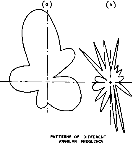 A fundamental property of such patterns is the closeness of the lobes and hence the rate at which successive maxima and minima of the echo occur as the fish rotates, ie the angular frequency of the lobes. Patterns with different angular frequencies are shown in Figure 15a and b, and it is clear that (b) has a much higher angular frequency than (a) which will lead to more rapid fluctuations of the echo. A fish could possess both of these patterns because it has a large dimension in one direction and a much smaller dimension at right angles to this, but in practice we are usually concerned only with small variations about the dorsal aspect.