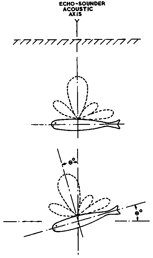 Although there is a maximum possible amplitude of echo from any particular fish, the actual size received depends on the angle of the lobe, or lobes of the directional pattern 'pointing' in the direction of the echo-sounder acoustic axis, see Figure 16.