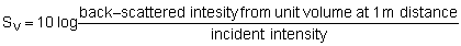 In practise the target strength of schools is only useful when horizontally directed sonar beams are used to measure discrete schools. For the present form of acoustic equation we need a term to describe the amount of energy back-scattered from the school or layer to the echo-sounder transducer. This is known as volume reverberation which depends upon a ratio called scattering strength, in decibel terms it is