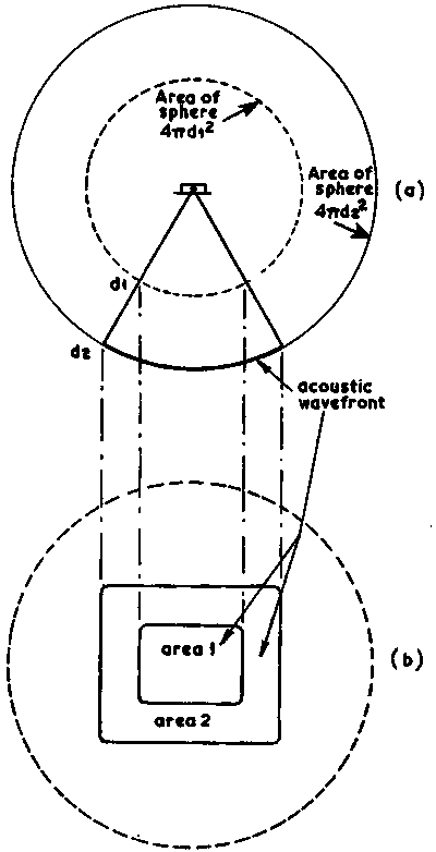 If an acoustic beam was infinitely narrow it would suffer no loss except for absorption. But when practical beams are propagated through water they spread so that the power WA covers a continually increasing area as distance from the source increases. We saw in 2.5 that acoustic intensity at any point is equal to power divided by area