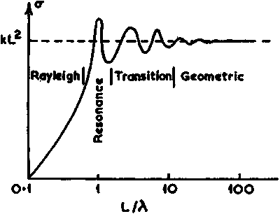 1. Rayleigh scattering when the fish is small compared to l, i.e. L << l. In this case s µ to (Volume)2 and l -4. Transition between this and the intermediate region occurs when the dorsiventral dimension of the fish is close to l, (a maximum dorsiventral size is 0.2 of total length).2. Resonant region where the swimbladder is caused to vibrate in sympathy with the frequency of the acoustic wave. It consequently absorbs and re-radiates more power than predicted by the Rayleigh approximation. In principle this effect can be used for sizing fish but in relation to present-day acoustic surveys the source of error in estimation due to resonance of small organisms is most important, see 9.6.4.