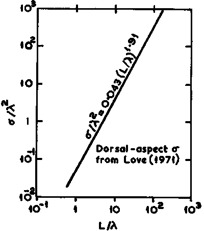 of McCartney and Stubbs (1971) from their own measurements on live fish. The technique of data reduction due to Love (1971) also used by Goddard and Welsby, was target strength expressed as an area and normalised by the square of the wavelength, is regressed on the fish length normalised by the wavelength.