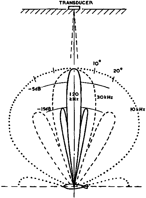 As the name implies, the transducer forms a dual beam which comprises coaxial narrow and wide beams, the main lobe of the narrow beam covering approximately the same volume as the region of unity response in the centre of the wide beam. The ratio of received intensity for targets in the two beams is given by