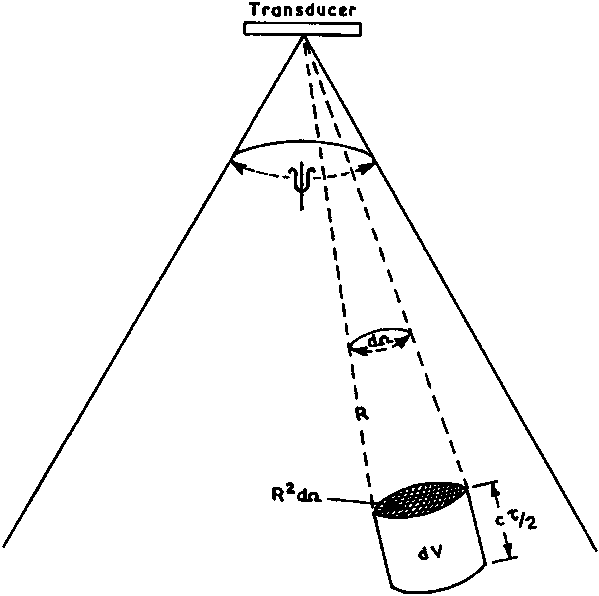 In Figure 39 the volume dV has an end face surface area of R2dW, where R is the range from the transducer and dW is the solid angle in steradians subtended by dV at the transducer. The length of dV is sufficiently small that, when insonified by a pulse, all scattering produced from its volume is received by the transducer at the same instant of time. This can be visualised by first considering the front surface of the pulse reaching and acting upon the scatterers at the rear of dV. The energy backscattered from this rear area will arrive at the transducer with the energy backscattered from the front area of dV by the rear surface of the pulse. Thus the length of dV is shown to be ct /2 (a similar principle is illustrated when the minimum separation of two targets in range by ct /2 is necessary to ensure that they are resolved, one from the other, see Figure 18.
