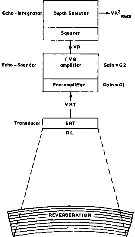 This is convenient because SL + SRT is a lumped parameter which can be measured by means of the standard target calibration procedure (see Chapter 7). It can be seen from Figure 40 that the voltage VRT is processed through the echo-sounder first by a fixed gain amplifier G1 and then in the TVG amplifier G2. These gains (in dB) must be taken into account, i.e. included in the eqn. G2 is normally the gain figure at maximum range of the TVG. All voltages from the echo-sounder are squared in the echo-integrator to convert from pressure to intensity proportionality. Adjustment for speed of vessel, selection of depth and depth interval is made.