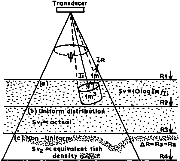 A number of simplifying assumptions regarding the distribution and density of fish (scatterers) plus other factors were given in section 4.5 and it is necessary for these assumptions to be fulfilled if accurate results are to be obtained. In practise the actual beam pattern of the transducer is replaced by the equivalent beam y, (section 4.6). The concept that there is unity response inside this beam and zero response outside is now adopted to simplify the explanation of volume backscattering.