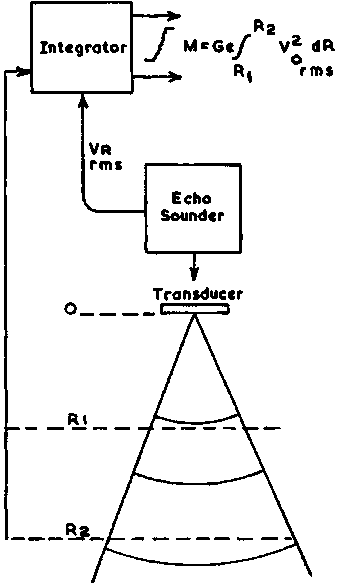 (a) a directly measured one-mile echo-abundance index for the insonified (sampled) water volume(b) a relative area density (biomass/mile2) between the individual one-mile sections. It is important to note that the echo-abundance index is not only a function of fish density, but also of the thickness of the actual fish layer occurring within the integrated depth limits. Thus, if a scattering layer of 20 m thickness produces a reading M20 = 100 mm, a layer of equal density but only 10 m thickness would give half the reading, i.e. M10 = 50 mm. To summarise, the use of the integrator as a measuring device results in