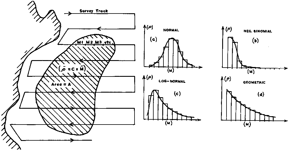 This has the limitation that it pre-supposes the arithmetic mean is valid, i.e. that the 'M' value, treated as a continuously random variable, exhibits a probability density function (PDF) which can be reasonably well approximated by the normal distribution. If that is true and C is an unbiased calibration constant, then the result would be an unbiased estimate of the mean fish density in the area. However, real-life data have demonstrated clearly that a set of M-data yielded by large-scale acoustic surveys is rarely normally distributed. In most cases it shows a highly positive skewness, or else the observations tend to fit the negative binomial (b), a log-normal (c) or even a geometric distribution (d) where the probabilities of occurrence of successively larger M-values are decreasing geometrically as indicated in Figure 43. Because of this it is important that survey data be submitted to appropriate statistical analyses in order to estimate the most representative mean fish density in the area. A more detailed coverage of the subject is given in section 10.3.