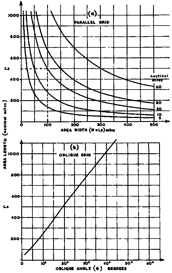 The above equation is useful for planning purposes because, for a given total survey track and selection of equidistant transect spacing (S) as parameter, it gives the relationship between the rectangular area, length versus width, and hence the corresponding area coverage. Figure 68(a) presents a graphical solution of this equation for: S = 5, 10, 20, 30 and 60 nautical miles.