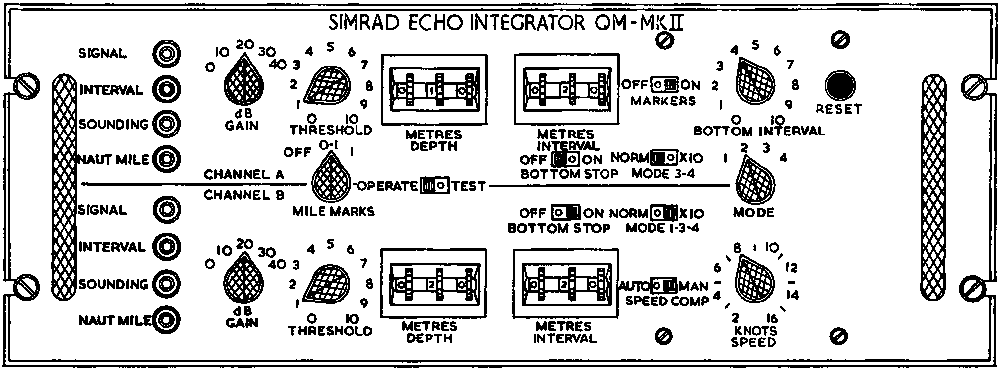This control should never be used if it can be avoided. The setting requires special caution, particularly during the integration of low densities and/or when relatively small fish makes up the target fish stock. A common practice to determine the optimum setting, is to display the envelope detected echo signal from the echo-integrator on an oscilloscope screen and carefully study the level at which the different echo components are rejected in response to a gradual increase in threshold settings on a scale 0-10. Subsequently the oscilloscope picture is compared with the corresponding echo recording (assuming that the 'Recording Gain' has already been adjusted so as to give the most representative recordings of the fish stock under study). The threshold control is then adjusted to a level whereby the faintest fish echoes just exceed the threshold setting. This is largely a subjective decision making process which has to be learned through experience and is really only applicable to relative abundance surveys. Common settings range from 0.5-3.0, also depending on the integrator gain setting as shown in the manufacturers specification. Replacement of the variable control by a switch system is strongly recommended.