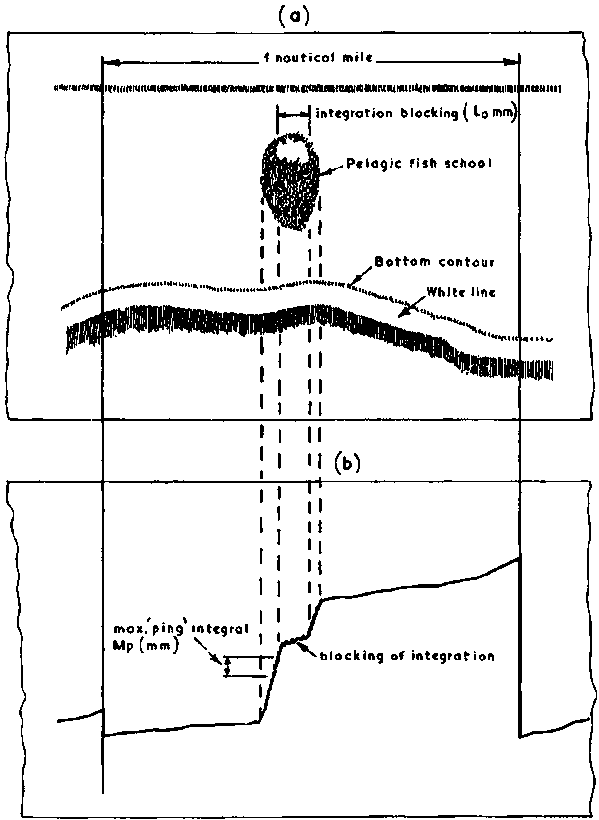 From Figure 79 we can define l0 as the observed length in millimetres of the school cross-section which is not integrated, indicated by the length of the white band at the top of the school trace. Mp = the maximum observed deflection (mm) for the individual pings prior to (or after) blocking. From the above, the total number of non-integrated 'lost' pings (Np) can be calculated from the relationshipNp = (Nt lo/lp)Assuming that lo = 4.7 mm, Np = 576 x (4.7/150) = 18 pings.