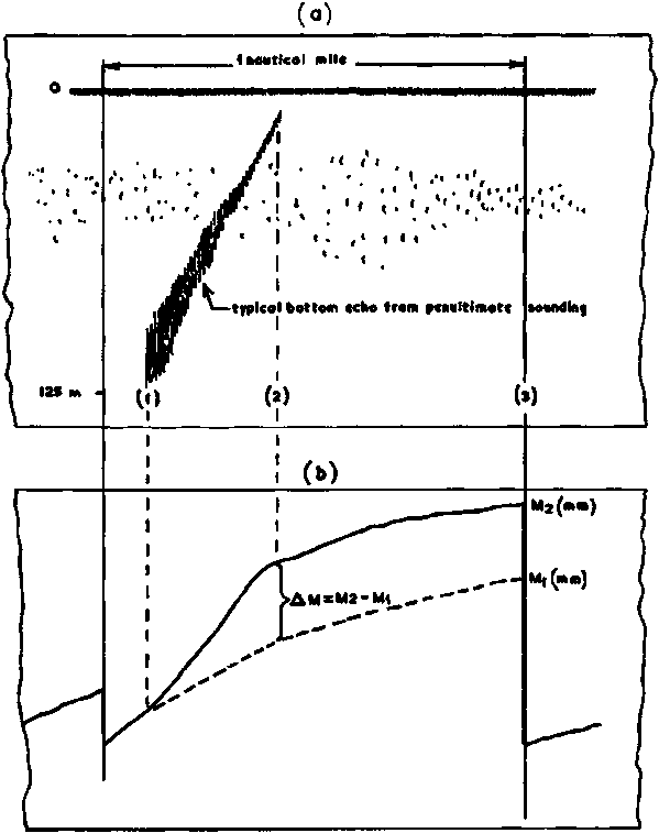 Taking this distance as the actual depth and considering the echo-sounder pulse train P1, P2, P3, P4,........ Pn (96 pulses per minute), it will be realized that the penultimate pulse, say P3, will return its detected bottom echo at the same time P4 is being transmitted. More generally, if the bottom depth varies in range from d1 = 468 m to d2 = 468 + 125 = 593 m, the second bottom echo can theoretically interfere with any other echo occurring in the basic range interval 0 - 125 m. The echogram (a), corresponds to a situation where the bottom depth has theoretically varied from 593 (point 1) to approximately 470 m (2). As indicated, the bottom trace appears strongly at the end of the 125 m scale and then gradually weakens until it usually fades out at, say 20 m range. This is due to the effects of the Time Varied Gain (TVG) function of the receiver. If the bottom depth had been a constant 520 m, the penultimate bottom echo trace would have been recorded as a relatively faint bottom at a constant depth of 50 m on the 125 m scale. Figure 80(b) illustrates the theoretical contribution to the integrator output of the unwanted bottom echo, resulting in an error reading of D M = M2 - M1.