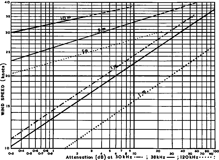 The rate of change of attenuation is 9 dB per 7 knot when the transducer is at 5 m depth but there is less than 0.3 dB loss until the wind reaches 23 knots. It should be pointed out that the authors only claim validity for their formula in the frequency range 8 kHz £ f £ 60 kHz and over the wind speeds of 6 to 30 knots. Nevertheless the results at 120 kHz are not dissimilar to those published by Dalen and Lovik (1981) although the latter authors include bubbles other than those from wind generated sources.