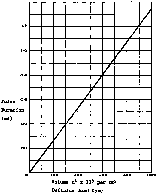 For each km2 of survey area, the total volume of water near the sea bed which cannot be sampled is 106ct /2 (m3) shown in Figure 87 for pulse durations of 0 to 1.2 ms. This clearly emphasises the need for the shortest possible pulse duration in order to minimise this zone which could be designated the definite dead zone (DDZ).