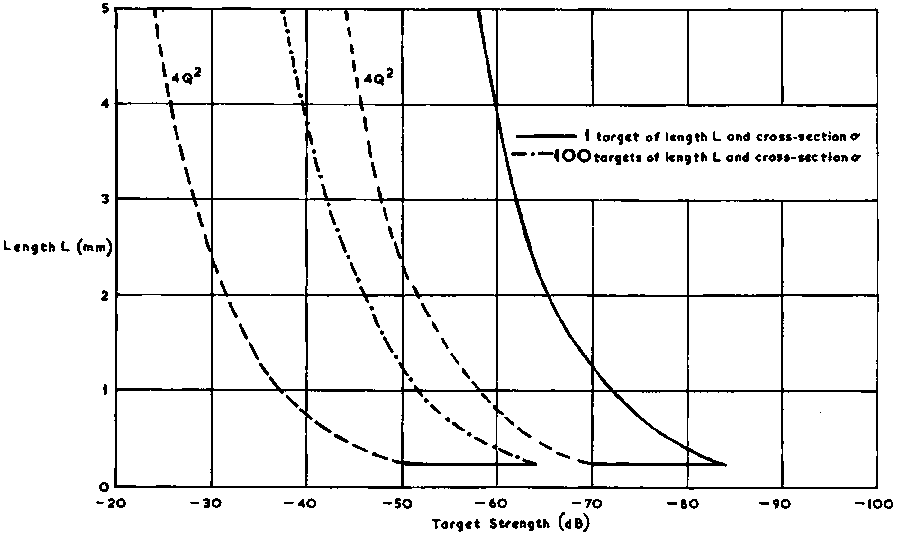At resonance an ideal bubble would have a ratio of acoustic cross-section to geometric-cross-section of 4Q2. Measurements on large fish, such as cod and saithe have shown Q to be about 2.5, but it is possible that smaller organisms may have higher Q's for the damping factor was thought to be due principally to shear losses within the tissue of the swimbladder wall. Even with a Q = 2.5 the ratio of acoustic cross-section to geometric cross-section is increased by 25 times (14 dB). The effect of this is shown in Figure 89 where the target strength of one organism 5 mm in length is seen to increase by this amount and 100 organisms of the same size could evidently reach a TS of -24 dB, comparable to a very large fish. A layer of such organisms at about 40 m depth might give a significant result on the echo-integrator used at 38 kHz. Because of enhanced TS of such organisms it may be difficult to discriminate between densely aggregated resonant targets and densely schooled non-resonant fish.