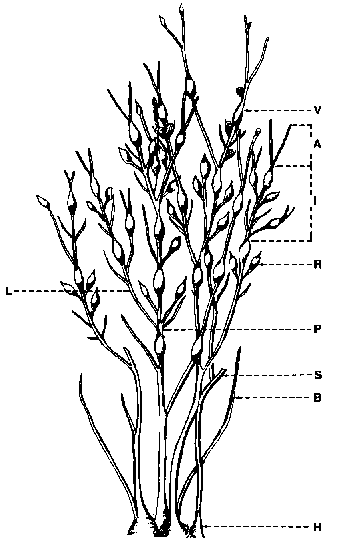 Figure 1. Ascophyllum nodosum fronds and associated terminology: A, apical tip; B, basal shoot; H, holdfast; I, internode; L/lateral shoot; P, primary shoot; R, receptacle; S, stump; V, vesicle.