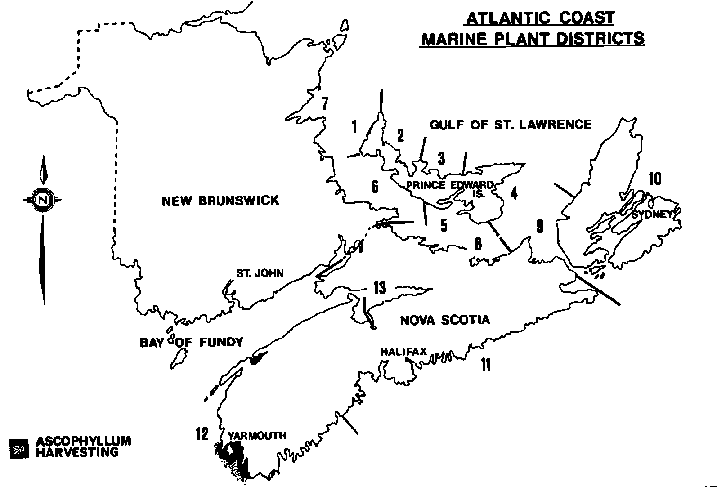Until 1933 records of Ascophyllum nodosum in Eastern Canada were limited to individual widely dispersed single collections in localized areas. Collections from a series of 93 sites scattered over the Bay of Fundy, Atlantic and Gulf shores of Nova Scotia, and the coast of Prince Edward Island listed Ascophyllum as abundant in the Bay of Fundy and Atlantic shores and occasionally around Prince Edward Island (Fig. 2) (Bell and MacFarlane 1933). Although there have been more recent collections from the Atlantic and Fundy coasts of Canada, (Edelstein and McLachlan, 1966; Neish, 1971) no new extensions of the species range have been reported.