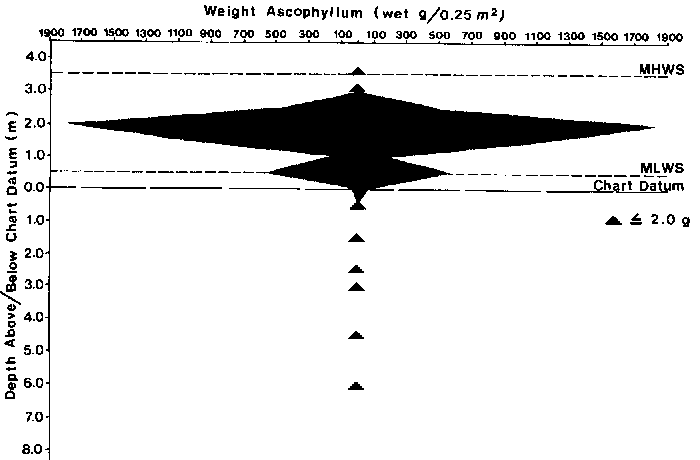 Ascophyllum nodosum is primarily a mid to low intertidal species. Free living ecads can be found in the upper intertidal and attached non floating forms occur in the subtidal (South and Hooper, 1980). In southwestern Nova Scotia A. nodosum occurs from the mean highwater spring tide line +3.5 m to -6 m (Fig. 4) (Pringle and Semple, 1980). Within estuaries the vertical distribution of attached A. nodosum is restricted to the mid to lower intertidal. (Chock and Mathieson, 1983). The distribution of biomass is examined in Section 4.3.