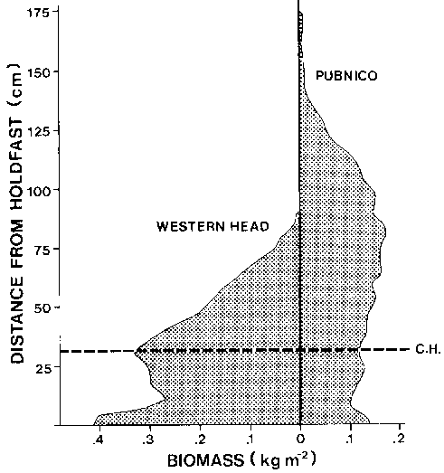 Figure 7. The distribution of Ascophyllum biomass within stand canopies at a wave exposed site (Western Head) and a sheltered site (Pubnico) southwestern Nova Scotia, (Cousens, 1981a). CH, mean cutting height of mechanical harvesters.