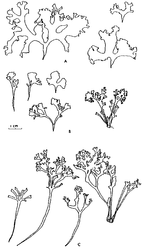 Figure 1. Morphological variation of Chondrus crispus populations at an estuarine (Dover Point) and two open coastal sites (Rye Ledge and Jaffrey Point), in New Hampshire, U.S.A. (from Mathieson and Burns, 1975)