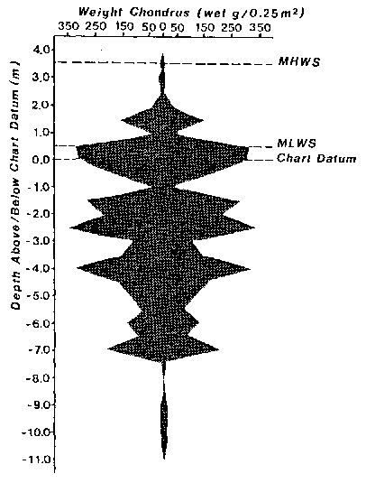 Irish moss extends from the littoral fringe (sensu Lewis, 1964) to -20m below mean low water, depending upon wave action, transparency and other local topographic conditions (cf. Bird et al., 1983; Femino and Mathieson, 1980; Mathieson and Prince, 1973; Prince and Kingsbury, 1973b). Even so, it is usually most abundant near M.L.W. to the mid subtidal zone (Mathieson and Prince, loc. cit.), with varying densities and morphologies occurring throughout this gradient (Fig. 2-4).