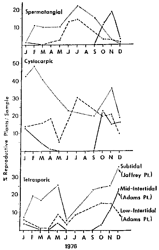 Figure 7. The reproductive phenologies of spermatangial, cystocarpic and tetrasporic plants of Chondrus crispus within the upper subtidal zone (-3m) at an open coastal site at Jaffrey Point, New Hampshire; as well as within the mid (+1.0m) and lower-intertidal zones at an estuarine site at Adams Point, New Hampshire; expressed as number (%) of each reproductive phase/sample (from Tveter-Gallagher, et al.; 1980).