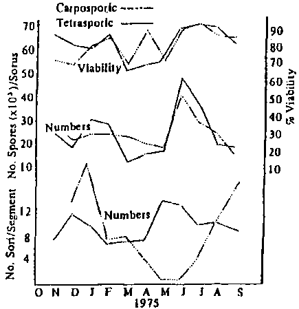 Field studies have documented different life history patterns (e.g. Craigie and Pringle, 1978; Mathieson, 1982; Mathieson and Prince, 1973; Section 4.2). Figures 7 and 8 summarize the in situ life history patterns of Chondrus crispus populations in New England, employing a variety of procedures as suggested by Prince and Kingsbury (1973a) - i.e. seasonal spore discharge rates, percent viability of spores, the number of sori/frond segment and diverse habitat sampling. These studies and those of Taylor et al. (1975, 1981) demonstrate a reproductive strategy involving prolonged sporic as well as broad-scale vegetative reproduction (cf. Section 4.5), with the former consisting of unimodal carpo-sporic and bimodal tetrasporic maxima and the latter of extensive holdfast regeneration. The duration and phenology of sporic and sexual reproduction varies spatially (Mathieson, 1982; Tveter-Gallagher et al., 1980, Fig. 7 and 8). Tetrasporic plants have maximum discharge rates in May - June (36-48 x 103 spores/sorus) and a smaller maximum in December-January (29-31 x 103 spores/sorus). Tetraspore viability was lowest during February -April (68-74%); thereafter, it ranged from 82-92% (Fig. 8). Cystocarpic plants showed maximum discharge rates during summer (48 x 103 spores/sorus), a clinal decrease during fall-winter, and lowest discharge rates and number of reproductive sori during April (20 x 103 spores/sorus). Overall, cystocarpic plants exhibited their highest sustained viability (85-92%) during summer. In demographic studies of intertidal populations in the Canadian Maritime Provinces, Bhattacharya (1985) found that the carpospore and tetraspore discharge rates never fell below 106 spores/m²/month, while they were maximal during September (i.e. 8.7 x 109 carpospores and 10.4 x 109 tetraspores/m²/month). Overall, the annual release rates of carpospores was 4.7 times greater than that of tetraspores. In contrast to Bhattacharya, Mathieson (1982) employed subtidal plants and emphasized individual frond discharge rates; thus, the two studies are not directly comparable.