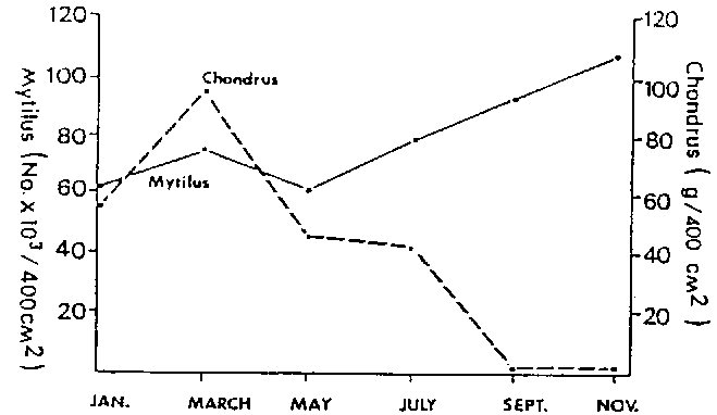 Chondrus crispus grows most abundantly on massive and stable outcrops (ledges) and boulders, with substantially reduced populations on smaller rocks and sand/or sediment-covered rocks (cf. Daly and Mathieson, 1977; Pringle and Semple, 1984). Occasionally, it will occur as detached populations (cf. Norton and Mathieson, 1983). Chondrus usually grows on shelving and horizontal surfaces, while adjacent vertical surfaces that are impacted by strong wave action, desiccation and freezing (Green, 1983; Lewis, 1964) are often dominated by Gigartina stellata (cf. Burns and Mathieson, 1972; Green, loc. cit.; Mathieson and Burns, 1975). Chondrus grows most abundantly on semi-exposed, open coastal sites; in addition, it is common in estuarine habitats, being particularly abundant where strong tidal currents occur (Conover, 1968; Kent and Buggeln, 1972; Mathieson and Hehre, 1986, Mathieson et al., 1983). The plant's extensive distribution in estuarine habitats (cf. Doty and Newhouse, 1954; MacFarlane, 1966; Munda, 1977, 1978) suggests a broad tolerance to temperature' salinity and light (cf. Mathieson and Burns, 1971; Mathieson and Prince, 1973). Even so, polluted harbor water and oil contamination can be harmful (cf. Boney, 1965; Grenanger, 1957; Marshall et al., 1949), while ice erosion in "northern" areas can be damaging, reducing the plant's reproductive potential and restricting it to crevices (cf. Bird et al., 1983; Hooper et al., 1980; Lilly, 1968). See Sections 4.3 and 4.4 concerning a variety of animals, bacteria, fungi and other plants that can adversely affect the survival and growth of Irish moss.