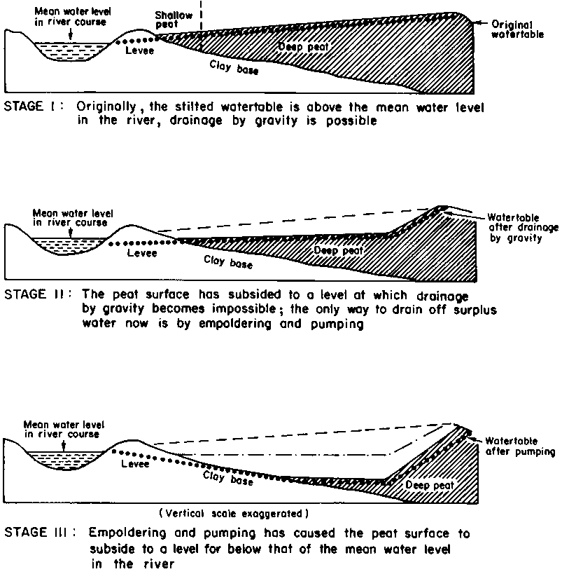 Figure 8. Possible stages in peat subsidence after drainage (source Andriesse 1972)
