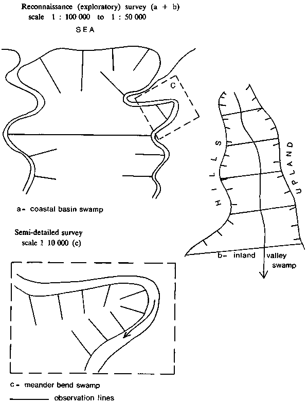 The area to be studied should firstly be reconnoitered using a scale between 1:50 000 and 1:100 000 depending on its size. Figure 18 illustrates how such a quick survey can be accomplished along transects. The position of the transects depends on the configuration and type of the peatswamps. Satellite images or air-photographs, if available, give important clues to configuration, vegetation and risk of flooding. The extent of the latter may vary with the season. Surveying is helped by easy access so the best season should be chosen for swamp investigations. The end of the driest season is usually the best time. It is always worth checking the extent of flooding of the peat at the rainy season when the highest local floods are expected. If it is not possible to visit the area at this time indicators or signs of flooding should be used later. Vegetation can be a great help, by the distinct marks left on trees (Plate 2) indicating the highest water levels during the wet season. These often remain clearly visible during the following dry season. If air-photographs are not available contoured maps are needed to supply the basic topographic information for the survey.