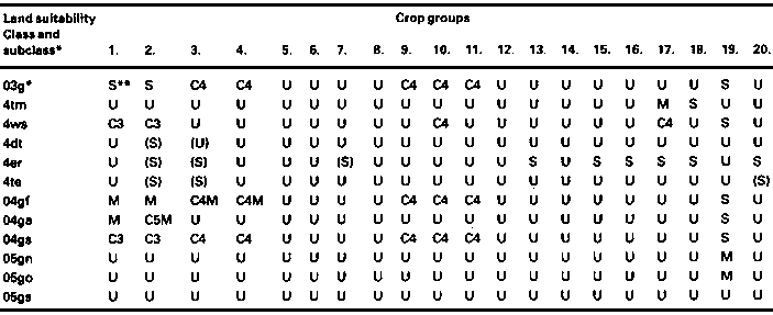 The matching or correlation of soil capability class with the indicated specific requirements gives a number of suitability ratings for relevant crops or ranges of crops as shown in Table 19. Land is either unsuitable (U), conditionally suitable (C - conditions are given), marginally suitable (M) or suitable (S). The reason for placing soils in the recognized suitability classes is indicated by letter symbols which are also used for the capability subclasses (see Table 18b).