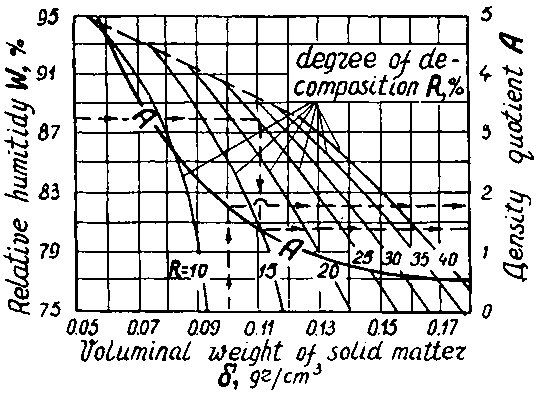 Since it is difficult to define the weight of solid matter of an undrained layer under production conditions, it is possible to choose values of A by means of the value of natural humidity, W, and the degree of decomposition, R. Determination of W and R is made by selecting samples with disturbed structure through the whole peat thickness. The nomogram (Fig. 38) also shows the method of defining the quotient A by these factors.